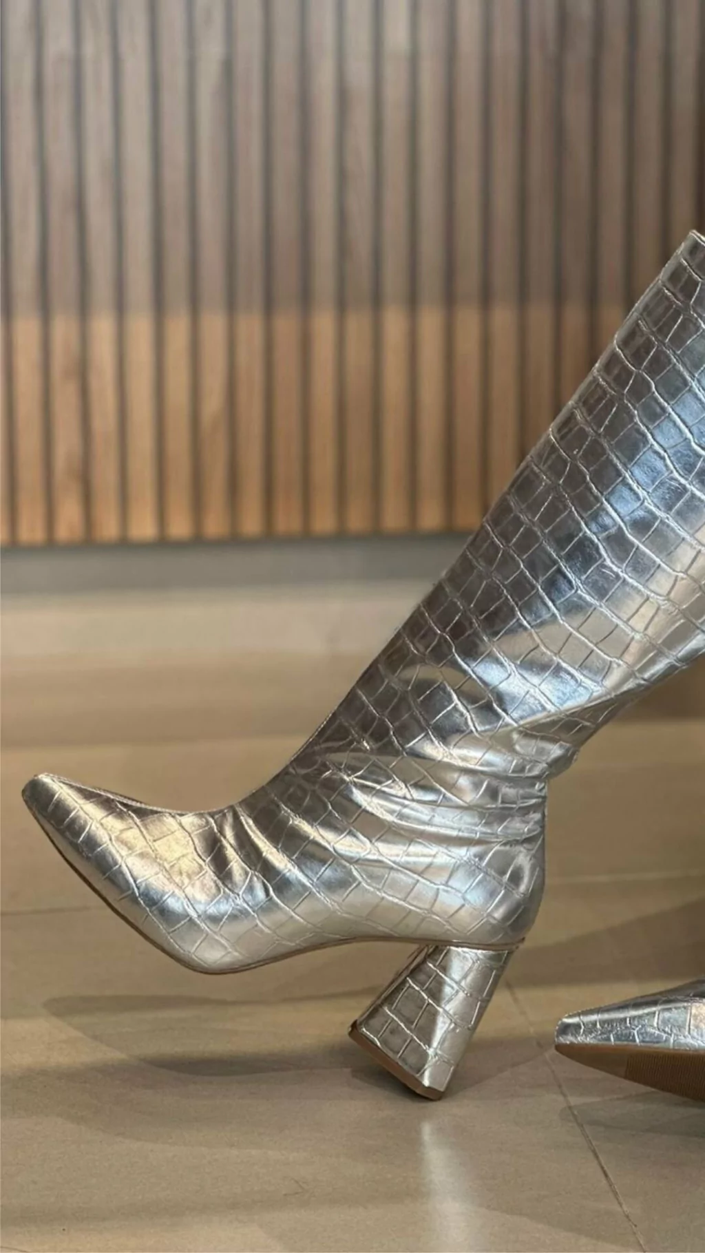 Apresentamos a deslumbrante Bota Natasha, uma verdadeira tendência da moda! Perfeita para compor os mais incríveis looks, a nossa bota Natasha é confeccionada em couro tipo croco, proporcionando um toque de elegância e sofisticação. Seu cano alto e salto em formato de triângulo conferem um visual único e estiloso.