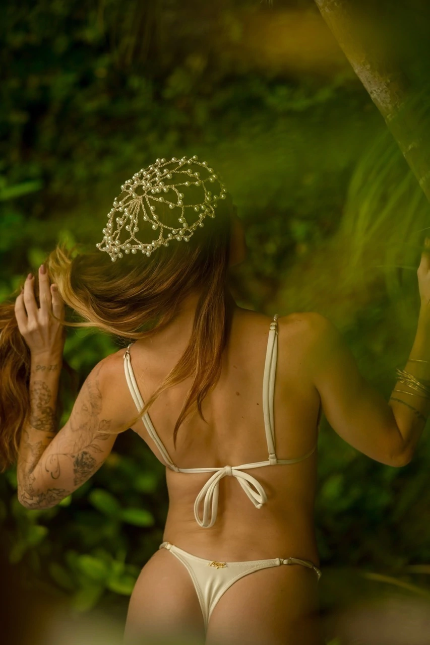 Headpiece em crochê bordada à mão com pérolas — delicadeza artesanal, brilho clássico e um toque de poesia para coroar qualquer look.