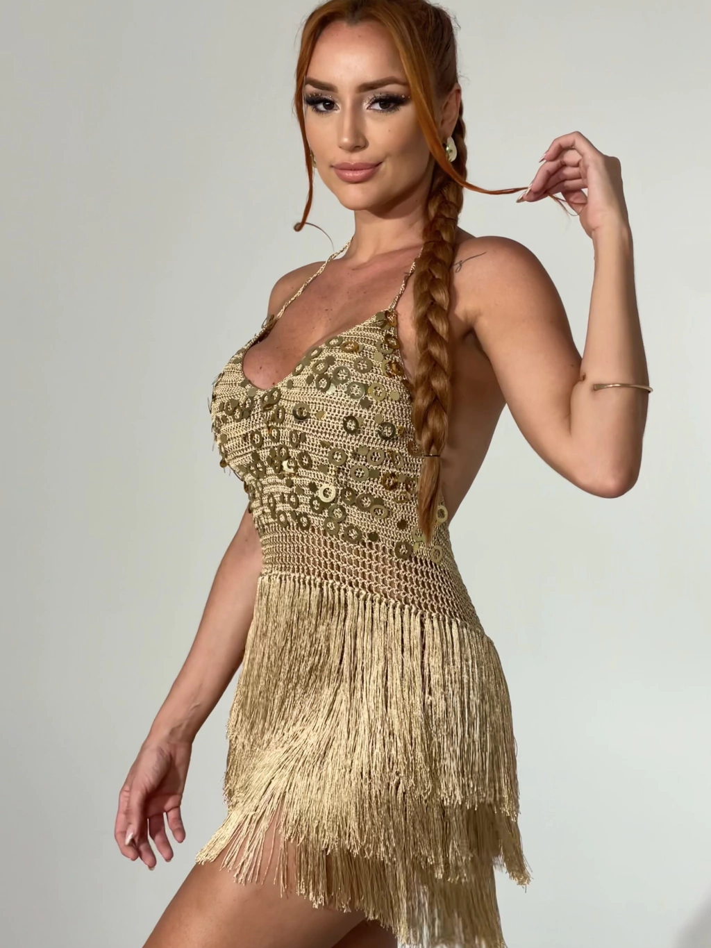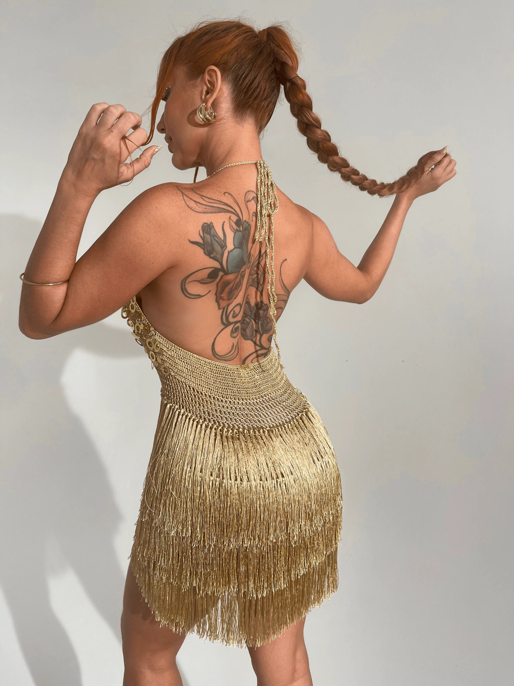 Vestido Amy Dourado: Elegância Artesanal em Crochê. Exclusivo e feito à mão em linha acetinada. Design sofisticado sem bojo. Tamanho único.